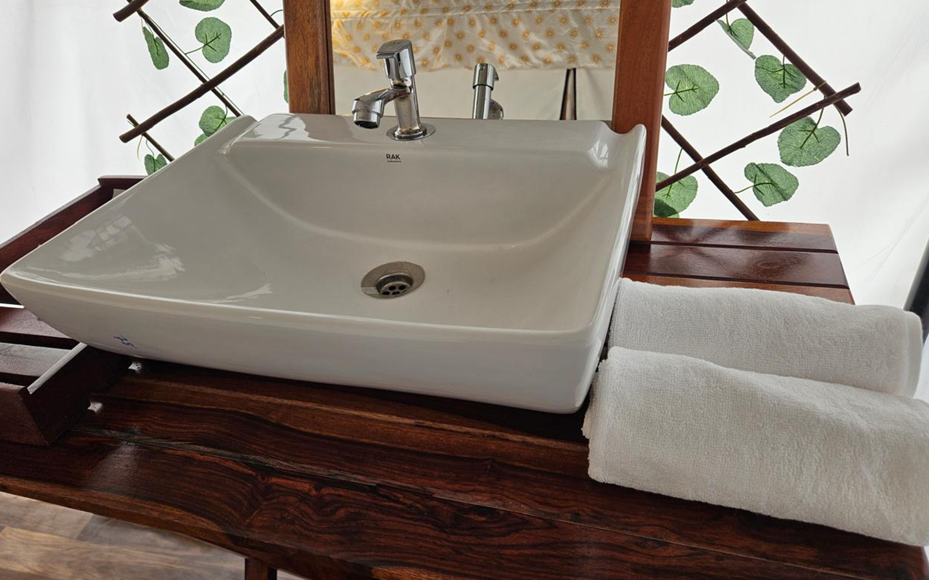 Each tent is thoughtfully designed to offer a roomy interior that combines modern amenities with a touch of rustic charm. The tents are equipped with a private bathroom that includes a shower.
